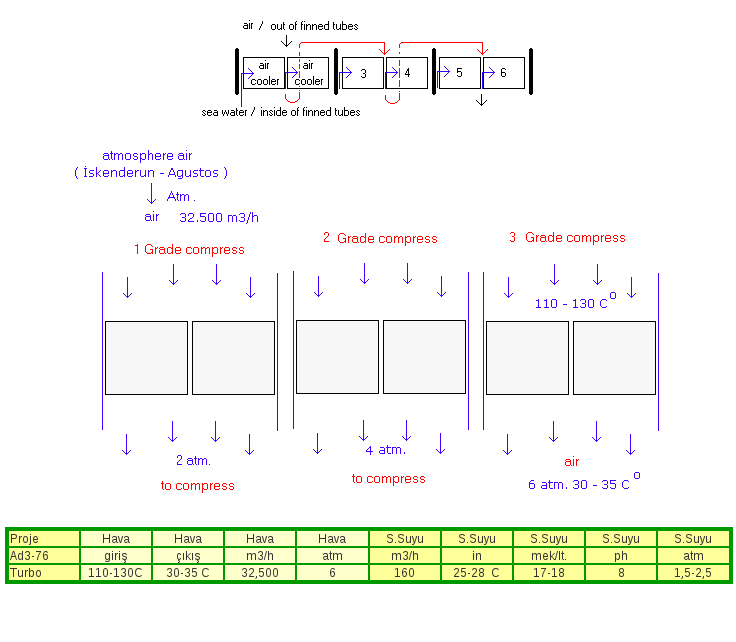 havayı 3 kademeli olarak sıkıştırıp basıncını 6 atm. kadar